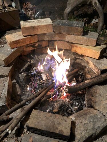 すこし風が吹いてるから、焚き火周りに耐火レンガを並べてみた。この耐火レンガは石窯作った時のあまり。 雪降って1週間だけど、まだ石窯の草屋根にも、ウッドデッキにも雪が残ってるの。 実は耐火レンガを積んだ効果はもう一つあって。 「おー、暖気が反射…